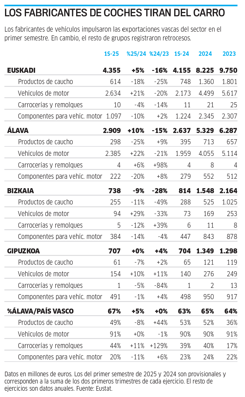 A pesar de que el sector de automoción europeo atraviesa por momentos complicados, lo cierto es que, en términos de comercio exterior, las compañías vascas relacionadas con el automóvil experimentaron en el primer semestre de este año, en líneas generales, una reactivación de sus ventas, que se elevaron hasta los 4.355 millones de euros, un +5% sobre la cifra del mismo periodo de 2024, según se desprende de las estadísticas del Eustat. No obstante, esta mejoría se circunscribió, únicamente, a los fabricantes de vehículos de motor, es decir, fundamentalmente a Mercedes. En concreto, este grupo (Cnae 291) vendió en los mercados internacionales por valor de 2.634 millones de euros, un 21% más. Como referencia, en la primera mitad del pasado ejercicio el valor de sus exportaciones se contrajo un -25%. Por lo que se refiere a los ingresos foráneos de las empresas de la CAPV encuadradas en la fabricación de componentes, piezas y accesorios para vehículos de motor (Cnae 293), alcanzaron un agregado de 1.097 millones de euros entre enero y junio (-10%), frente a un alza del +3% de un año antes.