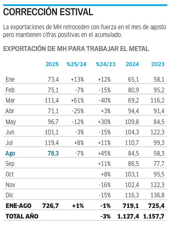 Por el momento, las exportaciones nacionales de MH para el trabajo del Metal y Otras MH acumulan un alza del 3% hasta agosto y la cifra de negocio de la industria de Maquinaria y equipo un 1,4%, mientras el IPI cae un 10,4% en el mismo periodo.