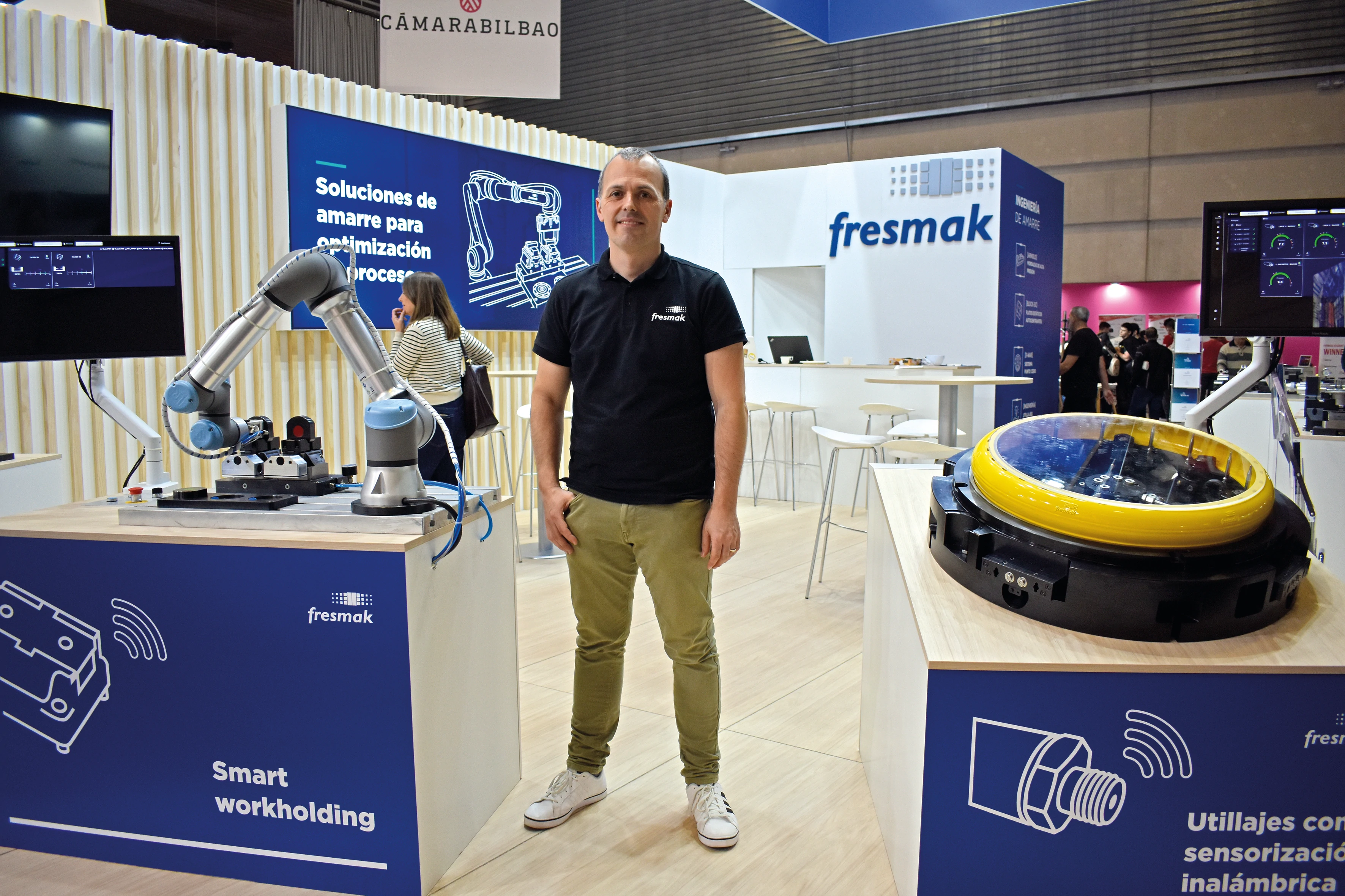 Fresmak ha dado un paso de gigante en la órbita de la sensorización con el desarrollo de un sistema de control del amarre con sensórica inalámbrica, pionero a nivel global. El fabricante de soluciones de amarre para industria ha emprendido una estrategia de diversificación en el ámbito del amarre inteligente que le sitúa en la rampa de salida de un mercado que avanza hacia la especialización en el diseño de sistemas de sujeción a medida. La solución presentada en la BIEMH, es resultado de un proyecto de I+D respaldado por el programa Hazitek de Lakua, en el marco de un consorcio de empresas vinculadas al mundo de la aeronáutica. Actualmente, el sistema se encuentra en fase de prueba en las instalaciones de uno de los colaboradores, con el fin de garantizar la sujeción de las piezas durante el proceso de mecanizado, mediante el uso de sensores inalámbricos y utillaje específico.